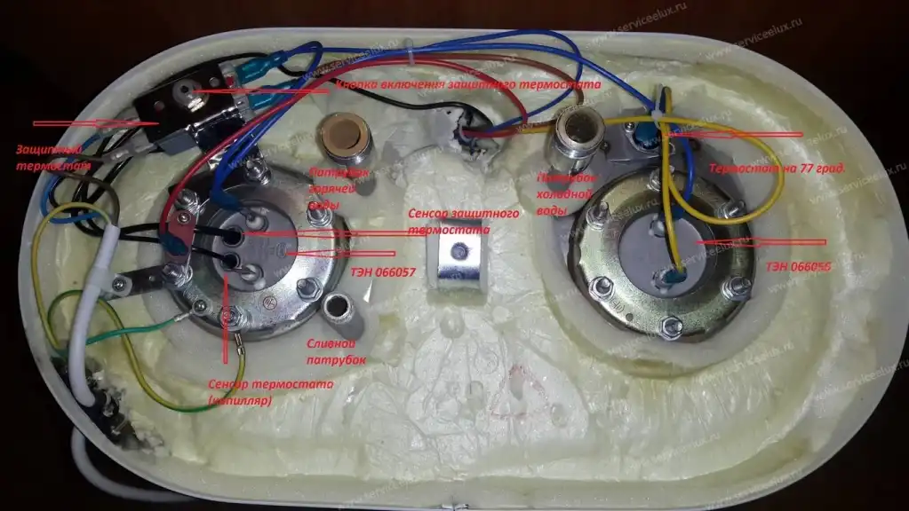 | Греет плохо, медленно | ![]() | 1.В моделях с двумя и более нагревательными элементами перегорел один из них; 2.Неисправен электронный модуль управления; 3.Образовался слой накипи на трубке ТЭНа; 4.Плохой контакт на питание нагревательного элемента; 5.Нагретая вода вытекает в стояк централизованной системы горячего водоснабжения через не перекрытый вентиль. | 1000-1500 руб. |